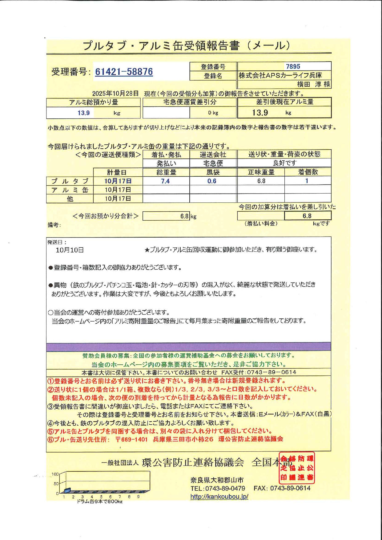 弊社が回収しました”プルタブ・アルミ缶”を「一般社団法人環公害防止連絡協議会に寄付させて頂きました。